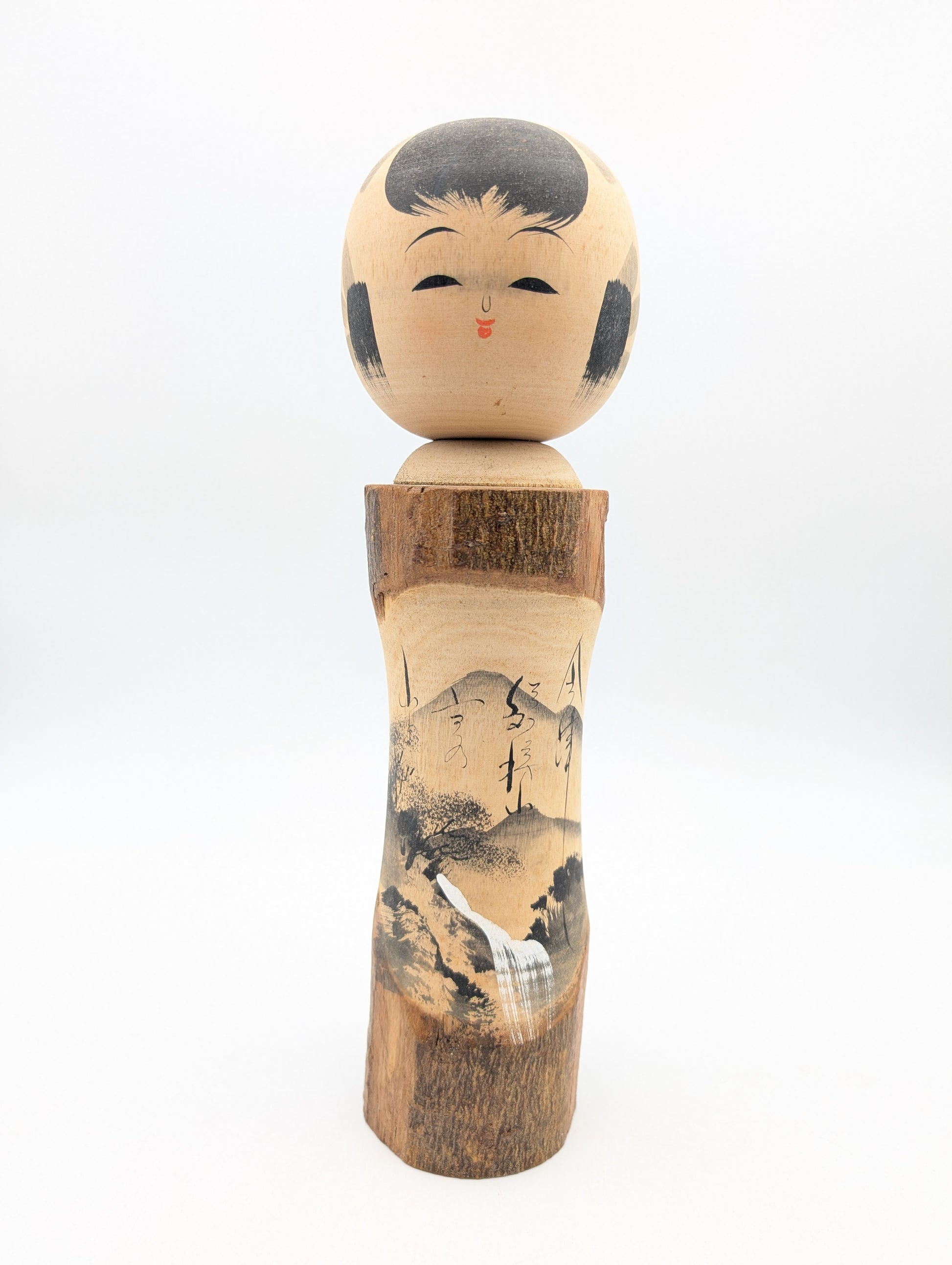 Kokeshi vintage in legno, realizzata a mano secondo il tradizionale stile Dento, con busto cilindrico e una testa sferica, splendidamente decorata con una poesia giapponese (haiku) e un paesaggio di montagna con cascata. Sotto la kokeshi è presente la firma dell'artista. Misure: 30cm x 7cm. Nonostante sia un pezzo vintage le sue condizioni generali sono molto buone.