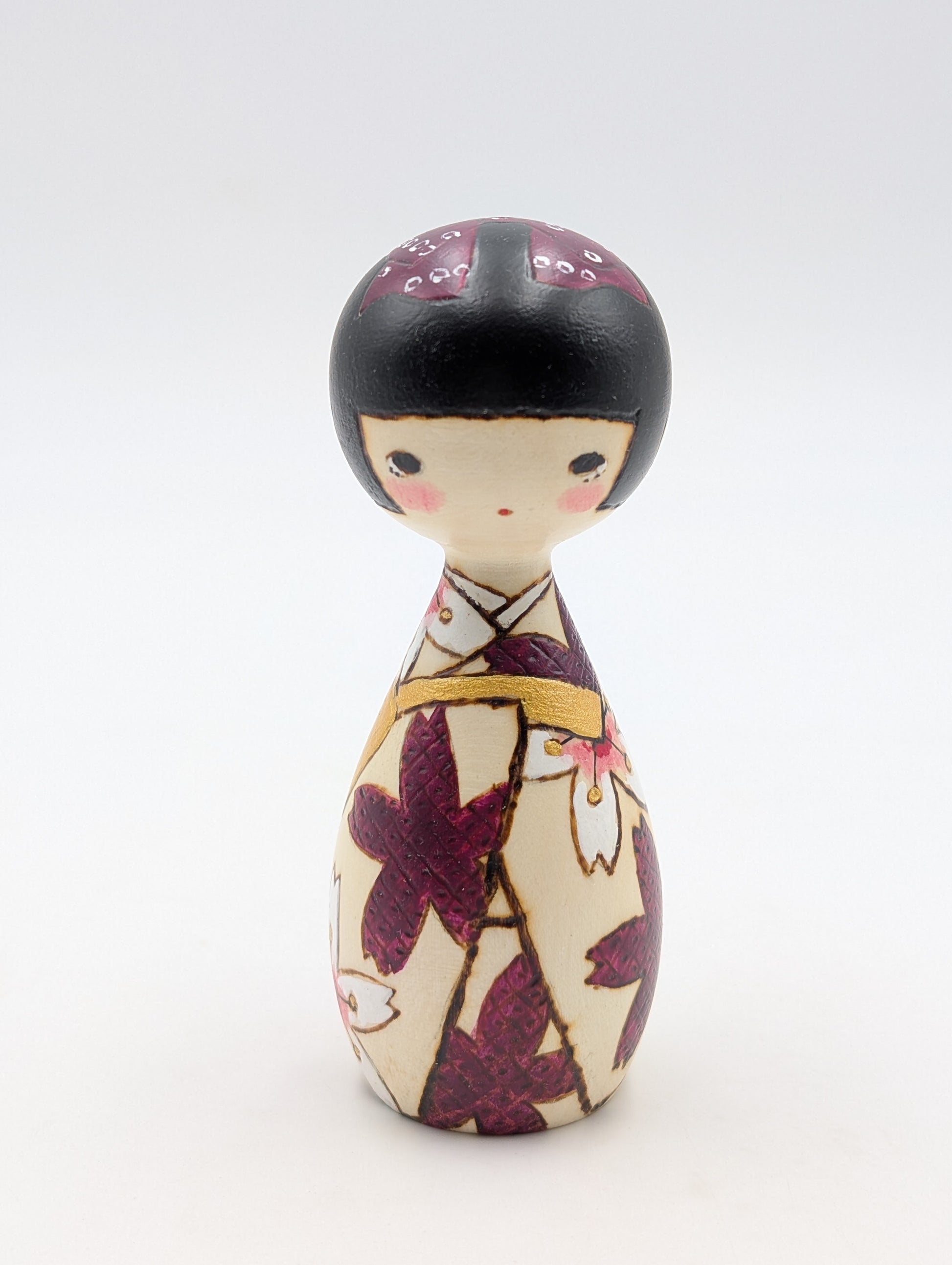 Il nome di questa kokeshi è Sakura, che in giapponese significa "fiori di ciliegio".