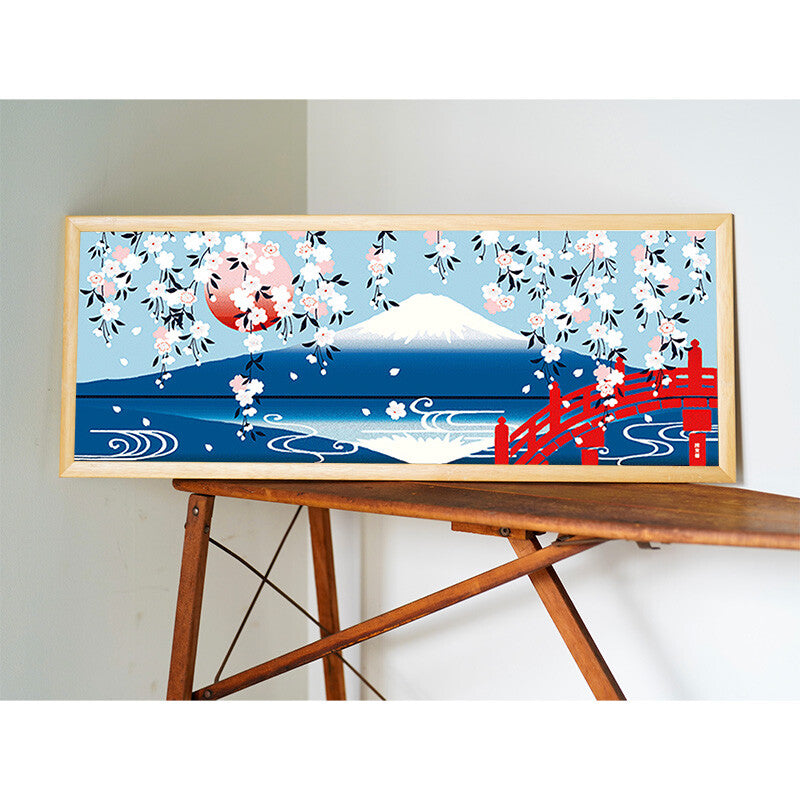 A tenugui is a rectangular piece of cotton cloth traditionally used by the Japanese as a towel, tea towel, handkerchief or bandana. It can also be used as a foulard, as a tablecloth or table-runner or it can be hung using a special support or framed as a piece of furniture. Mount Fuji and cherry branches (sakura) are depicted in this tenugui.