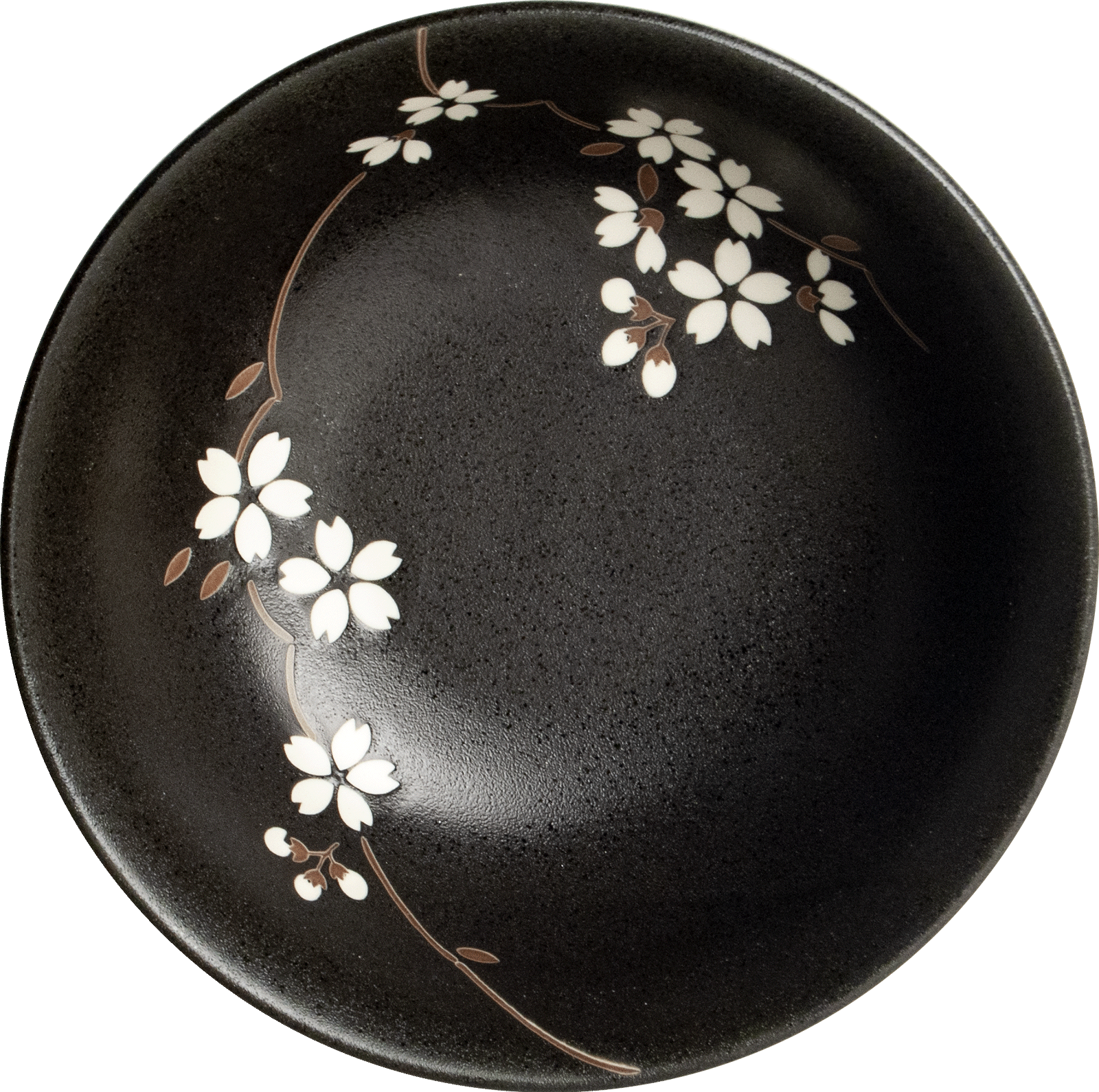 Ciotola da ramen di colore nero con decoro di fiori di ciliegio (Sakura) bianchi.