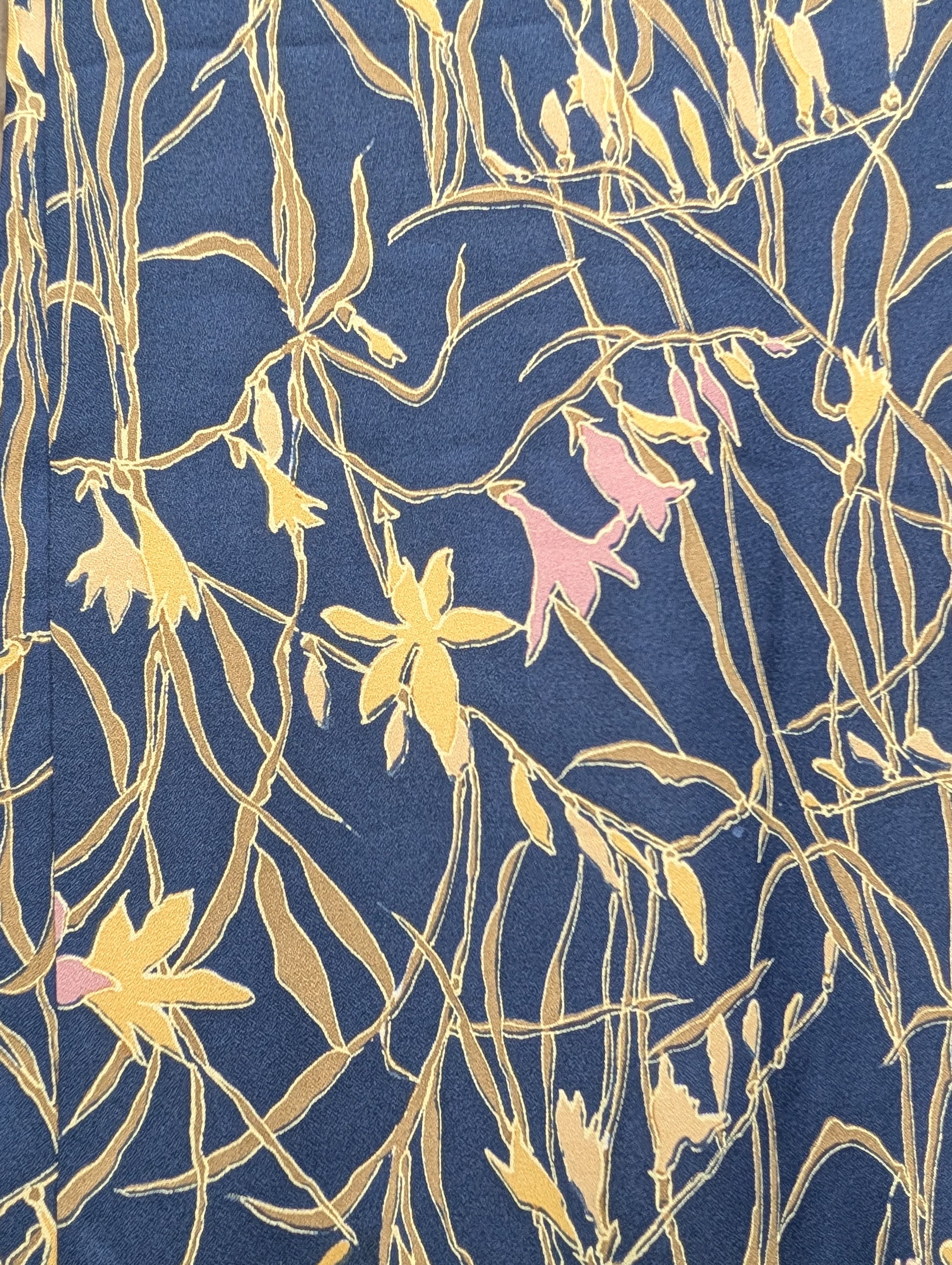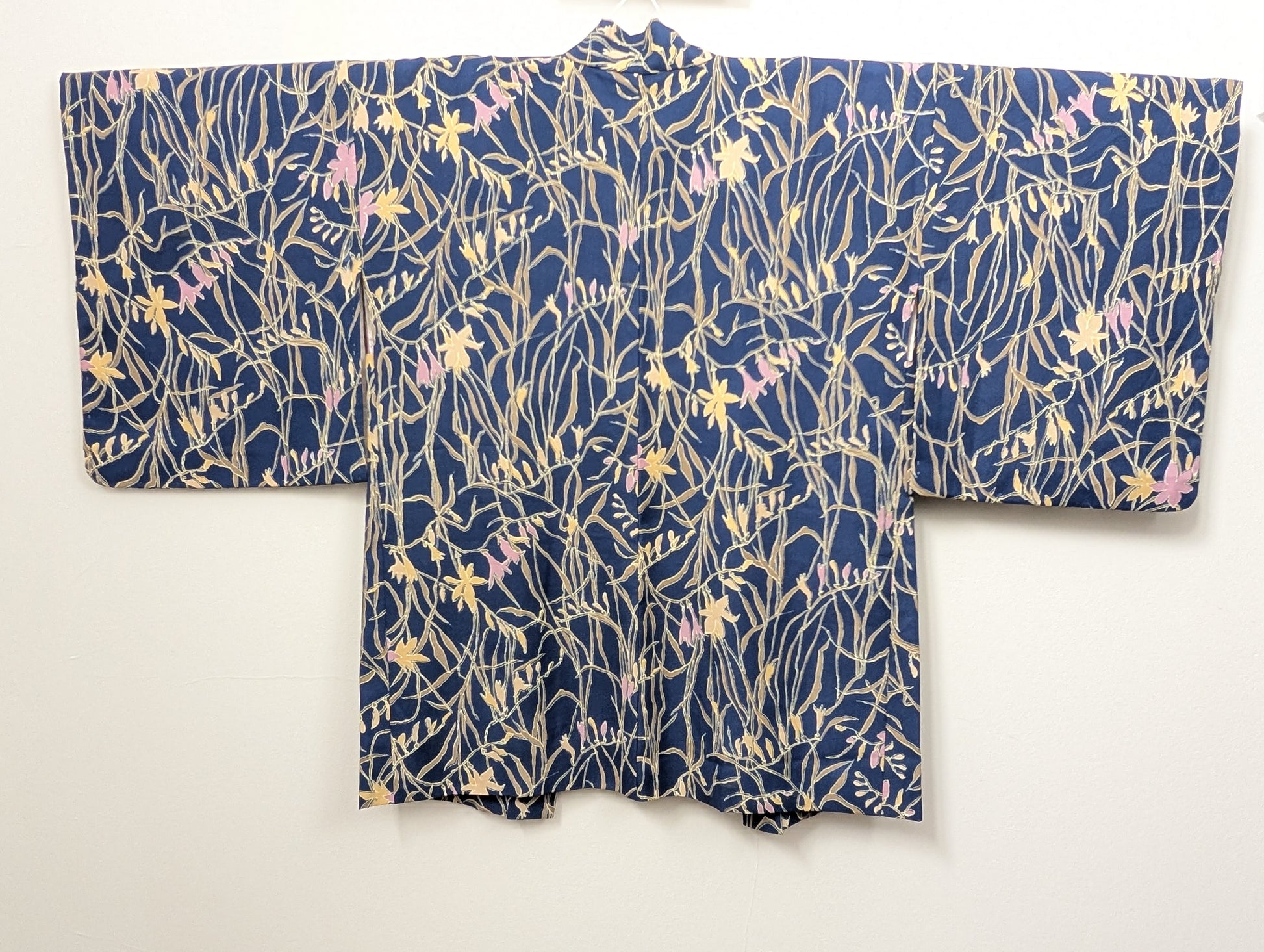 Haori da donna, di colore blu, con motivo floreale e vegetale dinamico. Sembra raffigurare erbe e steli con fiori a campana stilizzati, di colore giallo e rosa, che si intrecciano verticalmente, creando un senso di movimento e natura selvatica. Questo haori è un capo d'epoca originale giapponese, appartenente al tardo periodo Showa (1960-1989). E' un pezzo unico, cucito e confezionato interamente a mano. Nonostante sia un pezzo vintage le sue condizioni generali sono molto buone.