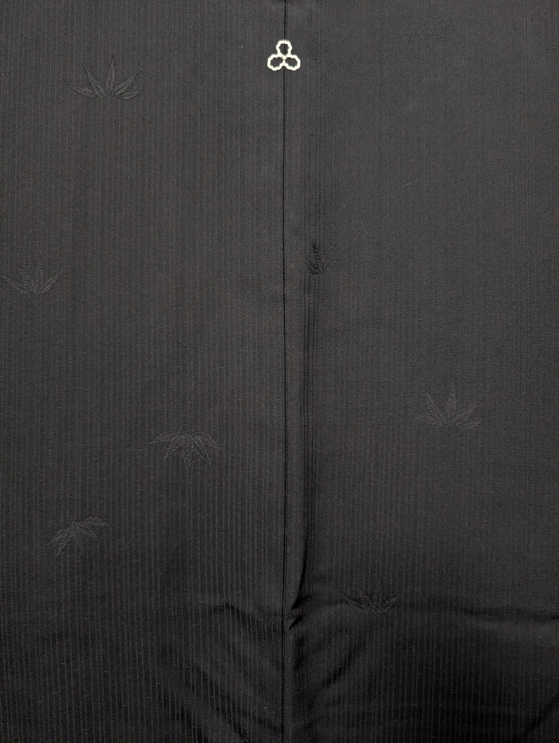 Haori formale da donna in pura seta, di colore nero con motivo di foglie di bambù e di righe verticali sottili.