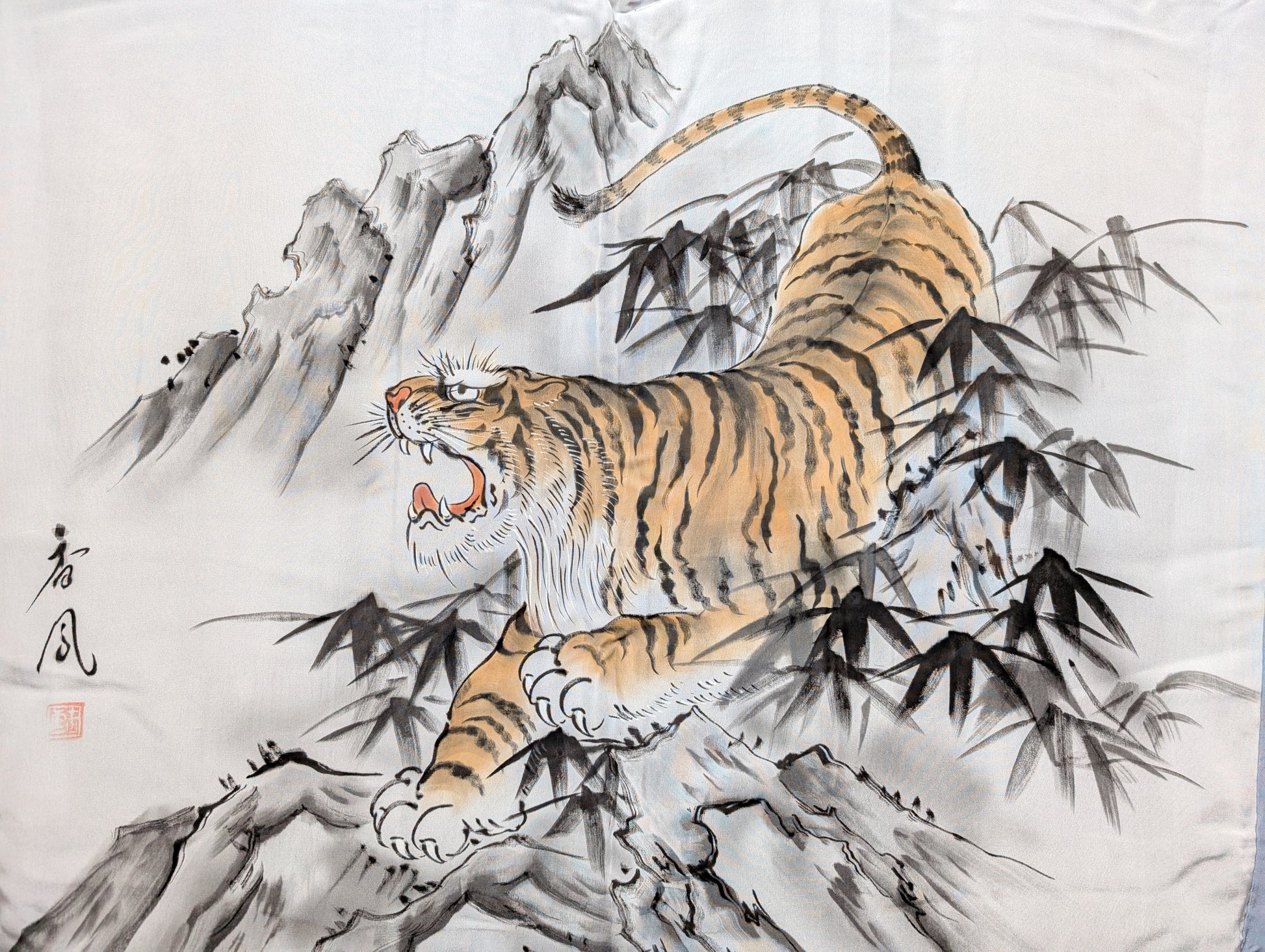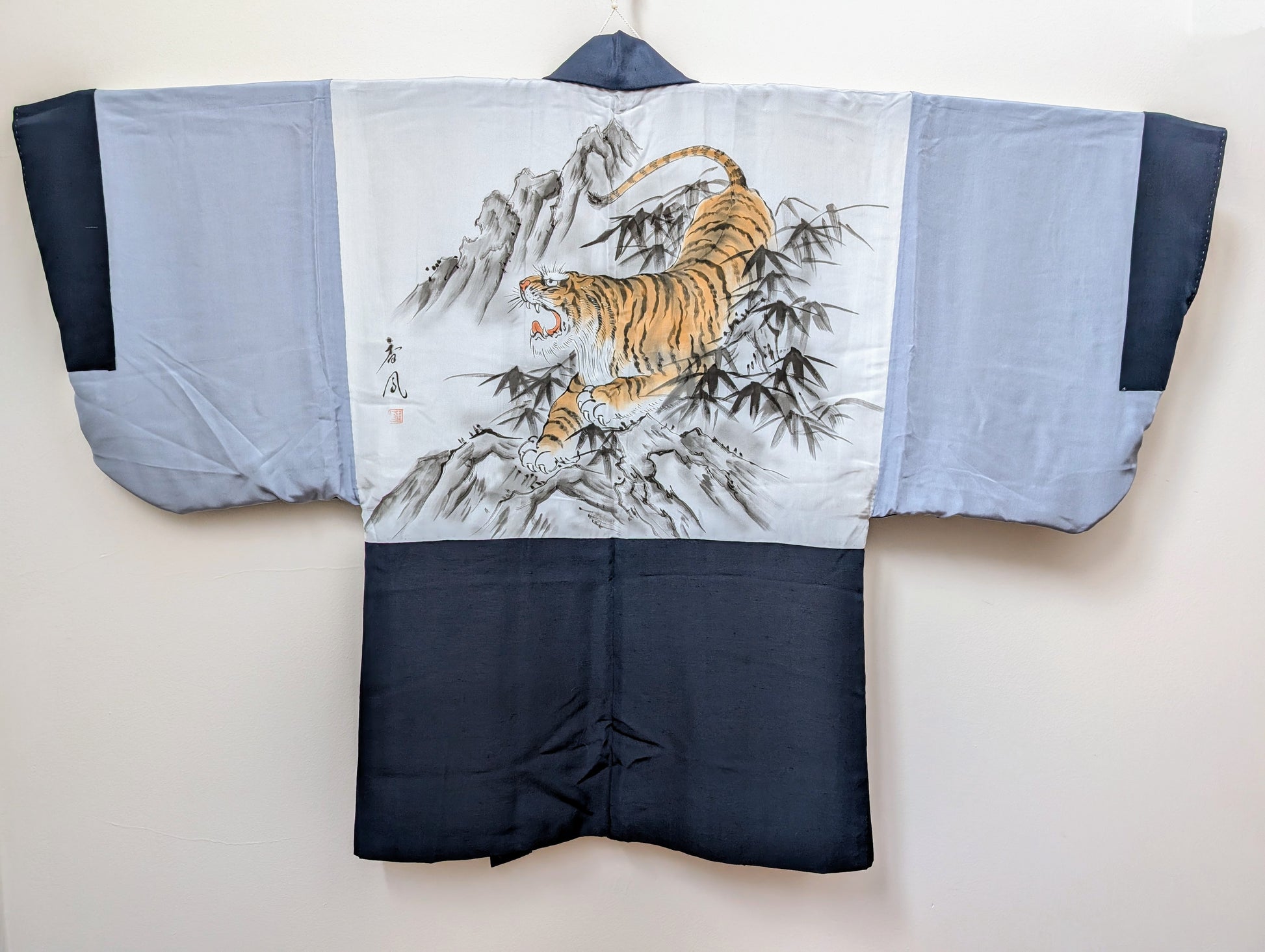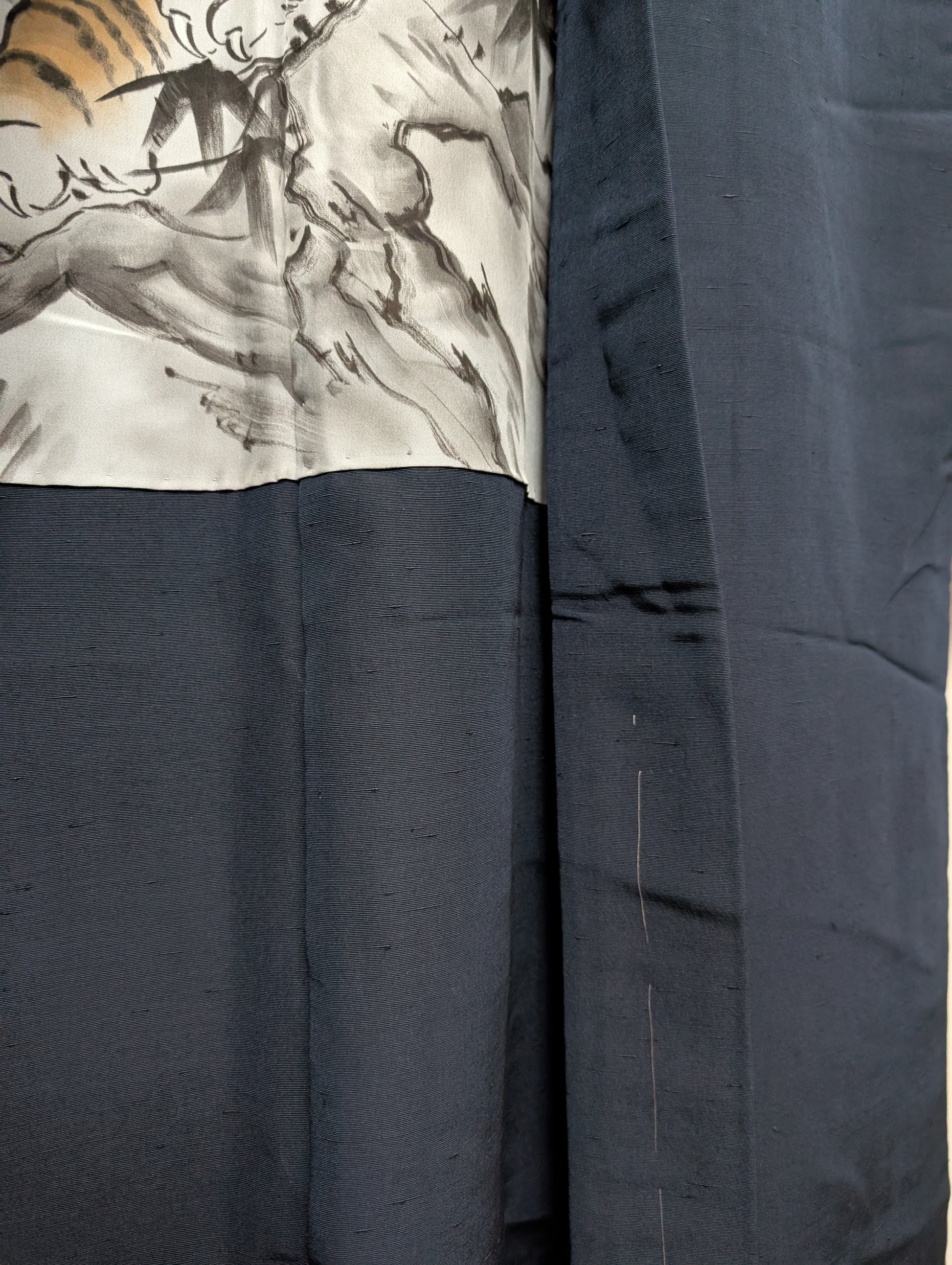 Questo haori presenta un design sobrio all'esterno e una sorprendente opera d'arte nascosta all'interno. La fodera interna infatti presenta un dipinto sul quale è raffigurata una tigre che scende da una montagna rocciosa in un boschetto di bambù. Sul lato sinistro della pittura è presente la firma dell'artista del dipinto.