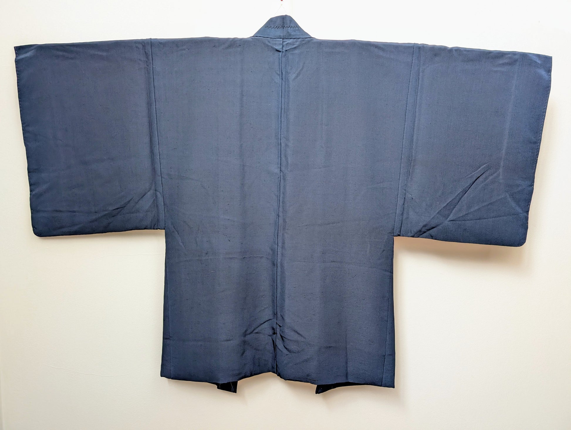 Haori da uomo (giacca tradizionale giapponese) vintage, realizzata in seta tsumugi di colore blu scuro. Questo tessuto è rinomato per la sua tessitura artigianale e la sua robustezza, unendo l'eleganza della seta con una finitura più irregolare, materica e informale.