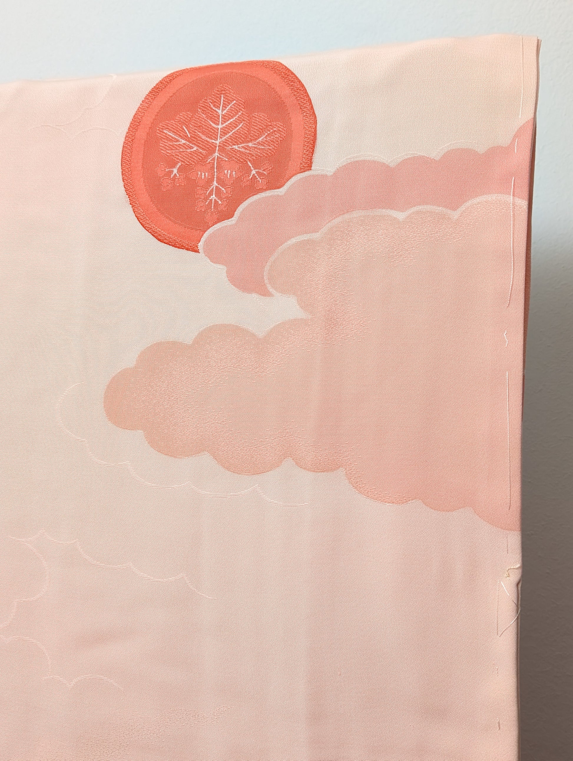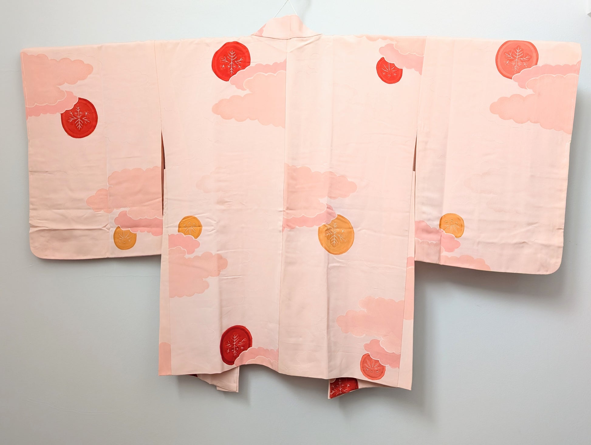 Haori da donna in pura seta nella delicata tonalità di rosa cipria con motivo di nuvole (kumo) e grandi cerchi decorativi dalle calde tonalità di rosso, corallo e giallo ocra.