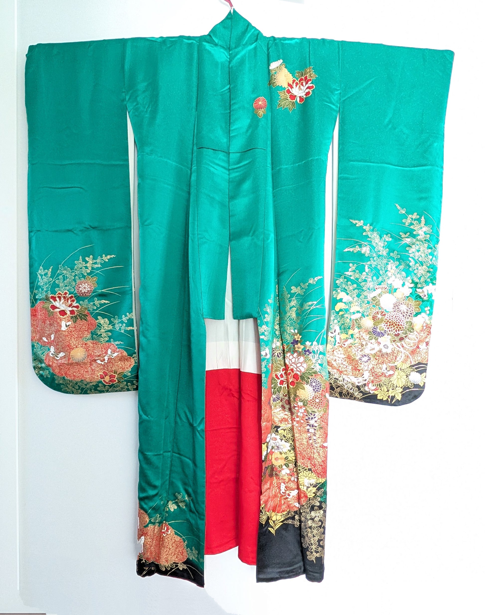 Di colore verde, presenta un lussureggiante motivo floreale con crisantemi (kiku), peonie (botan) e altri fiori più piccoli e sono presenti anche delle delicate farfalle sparse tra i fiori e il fogliame che aggiungono un elemento di grazie e movimento.