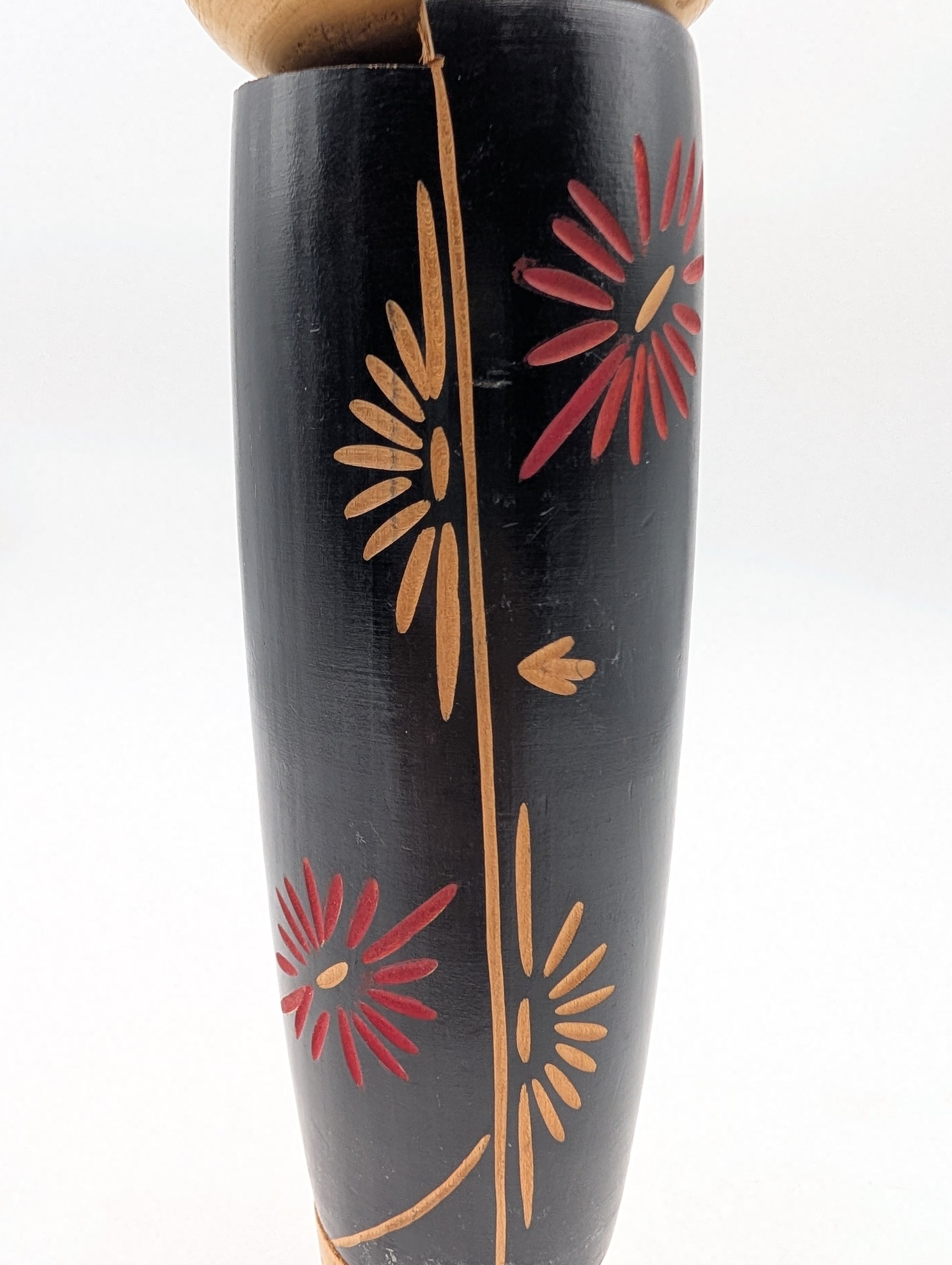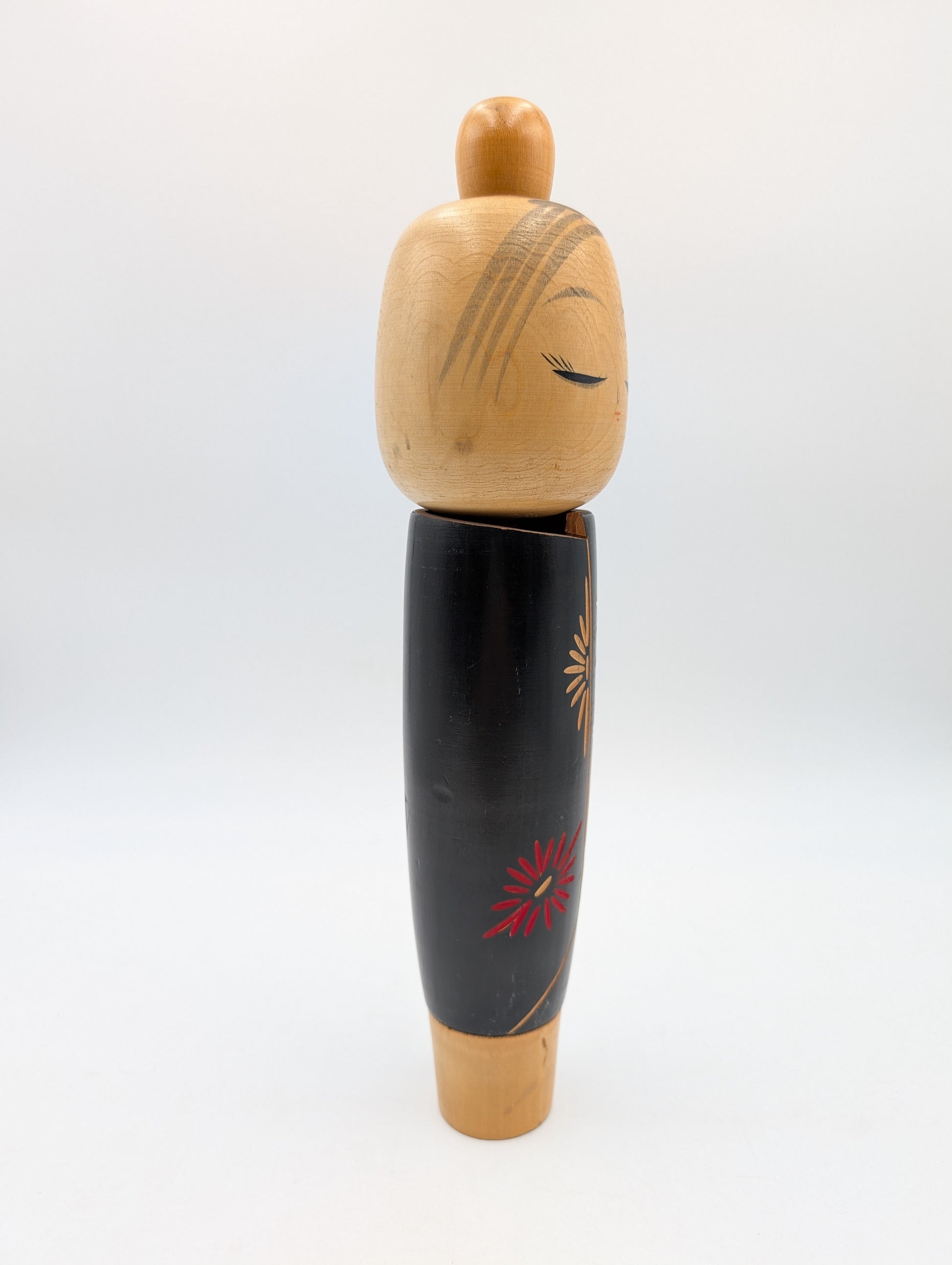 Questa elegante kokeshi raffigura una giovane donna che indossa un kimono di colore nero finemente inciso con motivo di fiori di crisantemo. Il crisantemo, chiamato anche “margherita dai 16 petali” è uno dei fiori più apprezzati e diffusi in Giappone, in quanto è considerato il fiore simbolo dell’Impero del Sol Levante infatti, proprio il disegno di un crisantemo stilizzato è lo stemma della famiglia imperiale. Sotto la kokeshi è presente il timbro dell'artista. Pur essendo un pezzo vintage le sue condizioni generali sono buone, presenta delle leggere imperfezioni che non ne pregiudicano comunque pregio e bellezza.