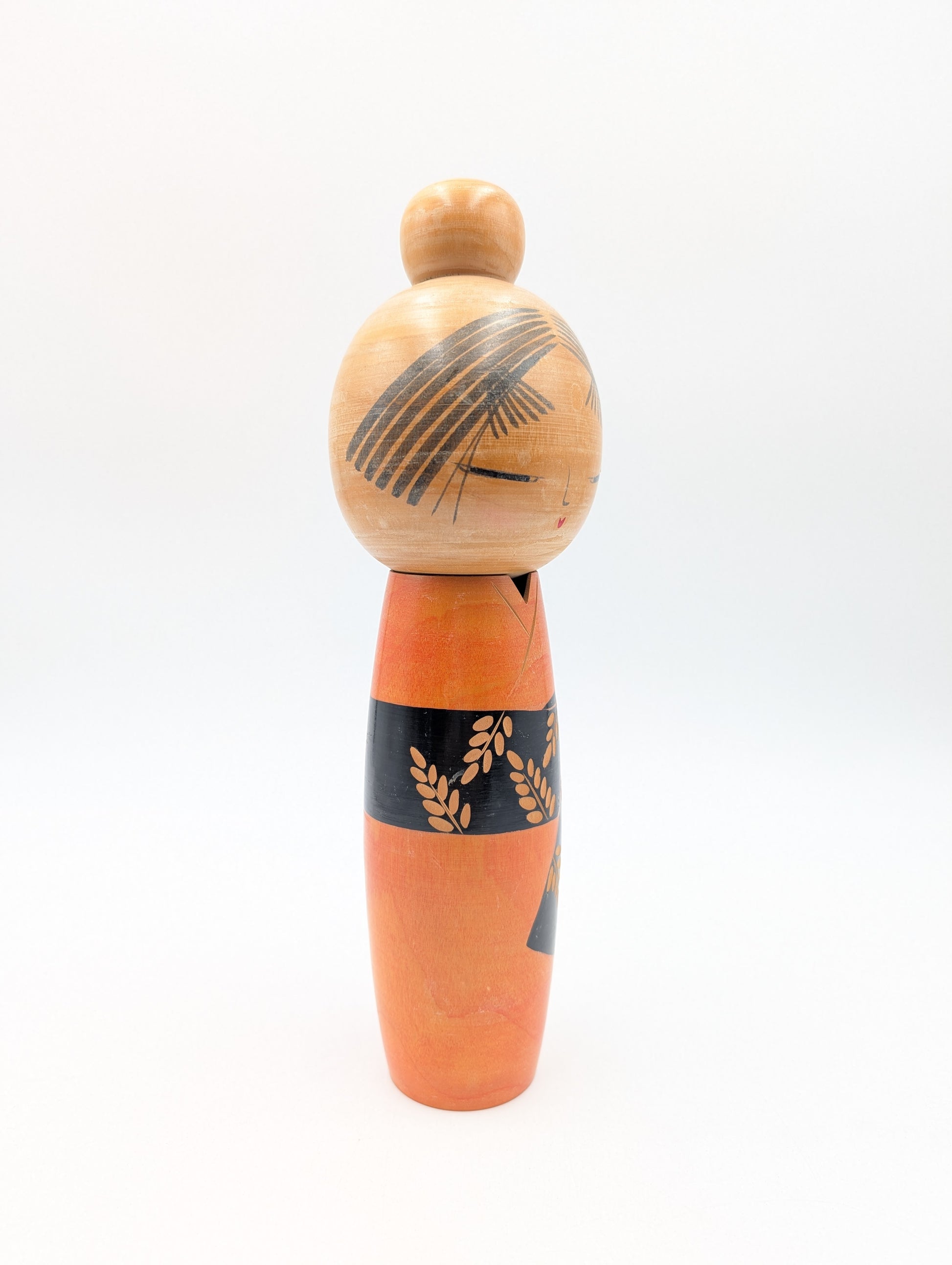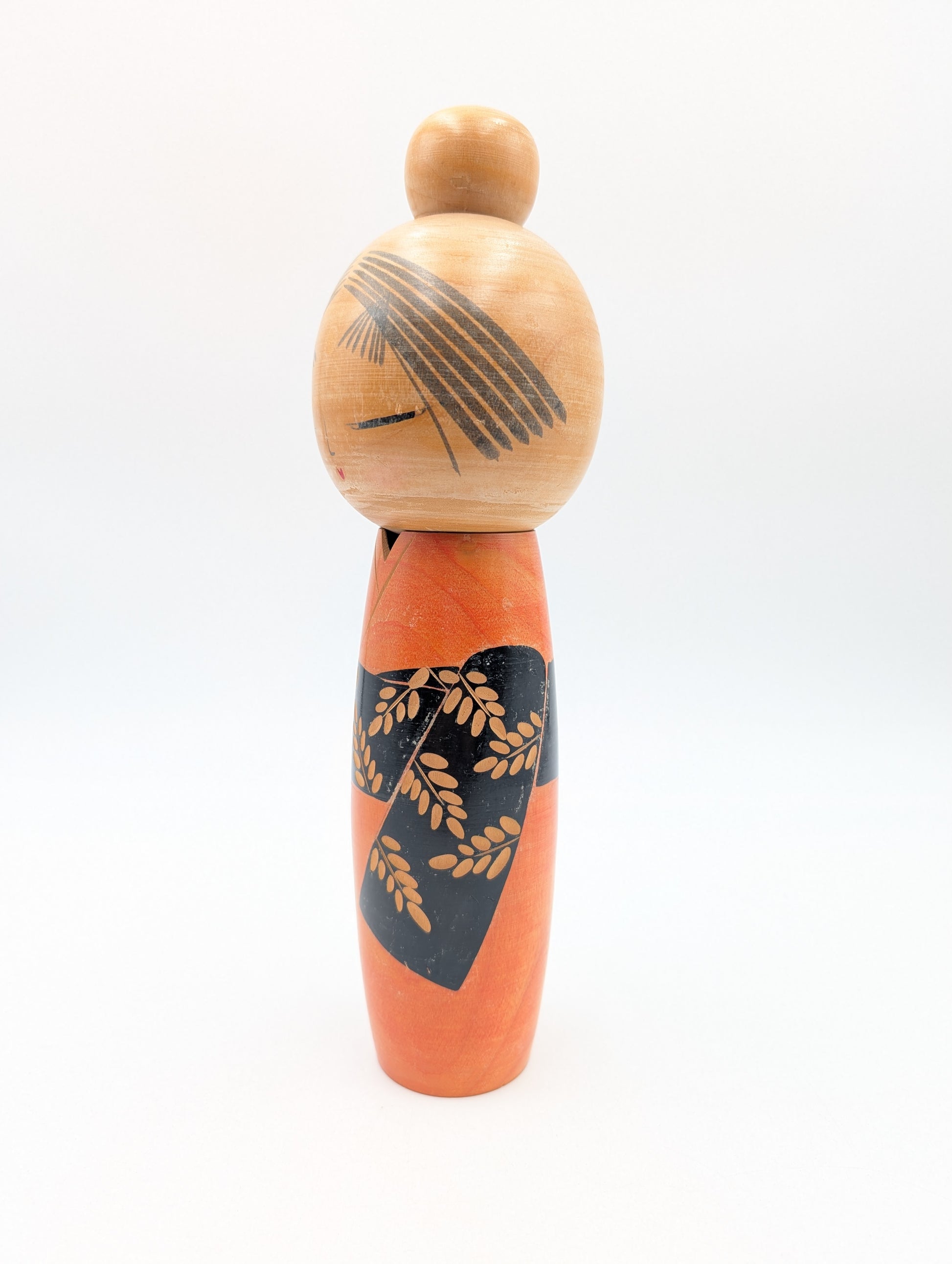 Questa elegante kokeshi raffigura una giovane donna che indossa un kimono color arancio e un obi (cintura) di colore nero con un motivo di foglie finemente inciso. Il suo viso, dipinto con tratti minimali ma espressivi, trasmette pace e serenità. L’acconciatura è raccolta in un elegante chignon. Pur essendo un pezzo vintage le sue condizioni generali sono buone. Eventuali piccole imperfezioni nella pittura o nel legno sono da considerarsi normali e contribuiscono al suo fascino e alla sua unicità.