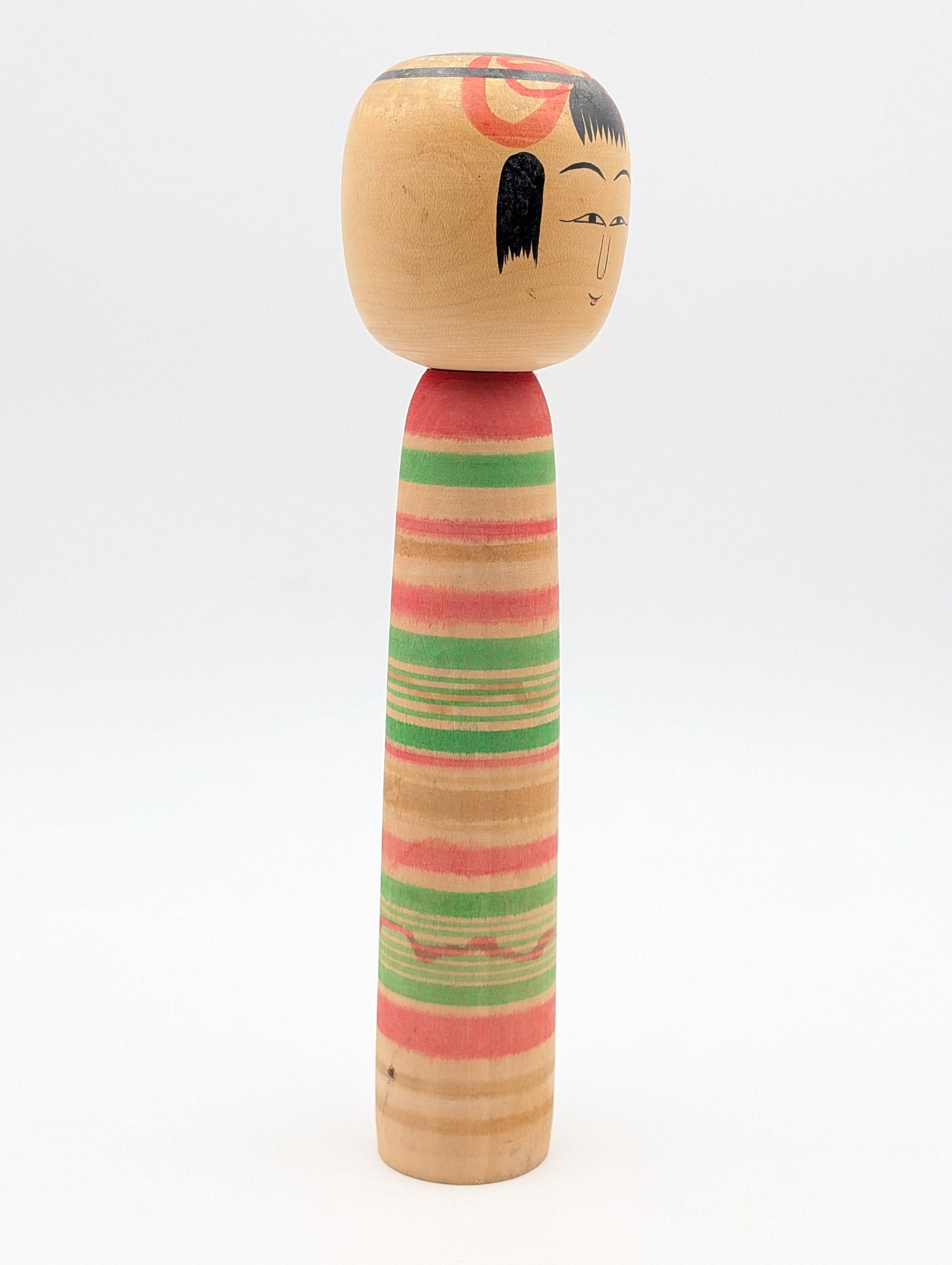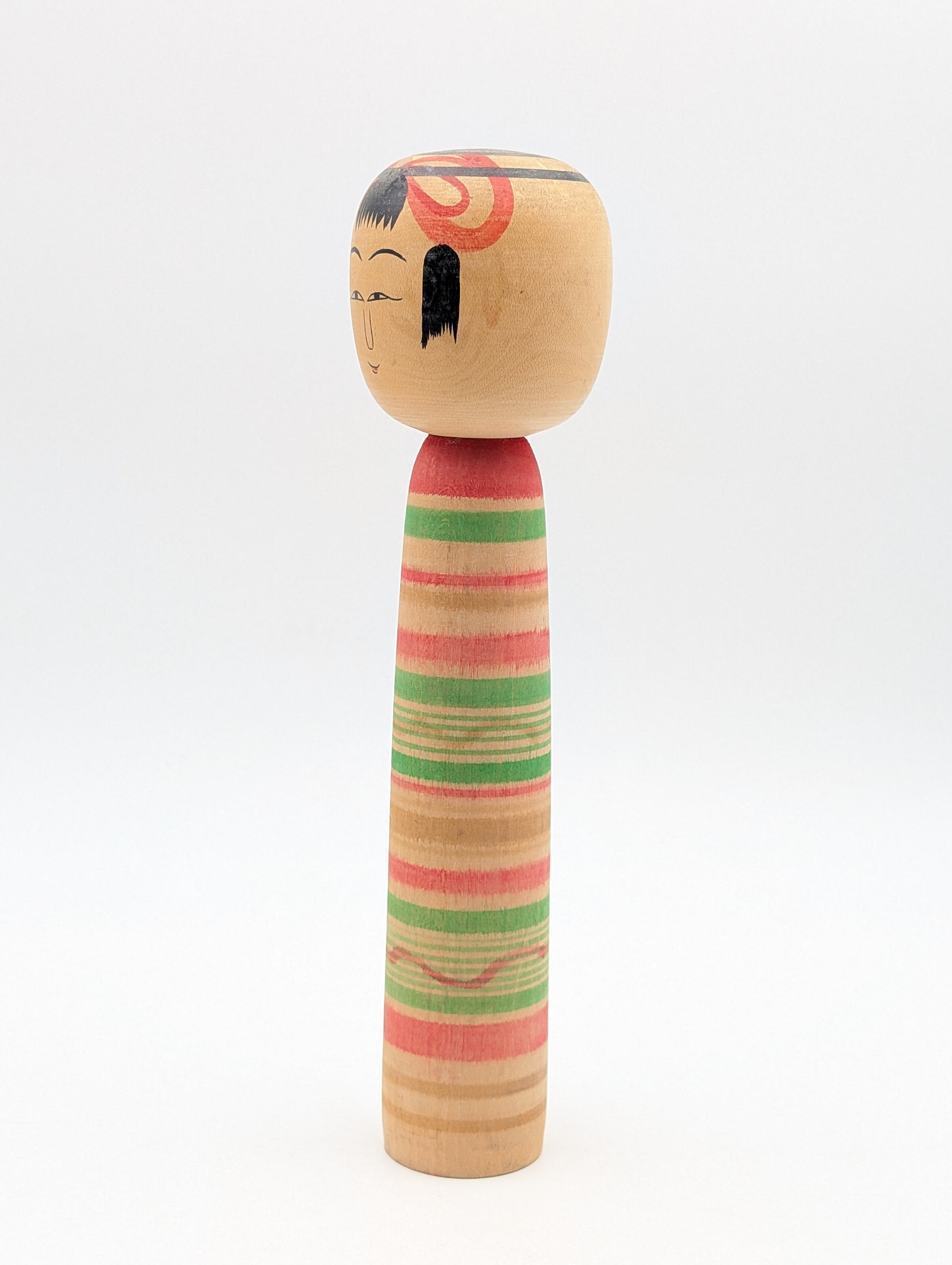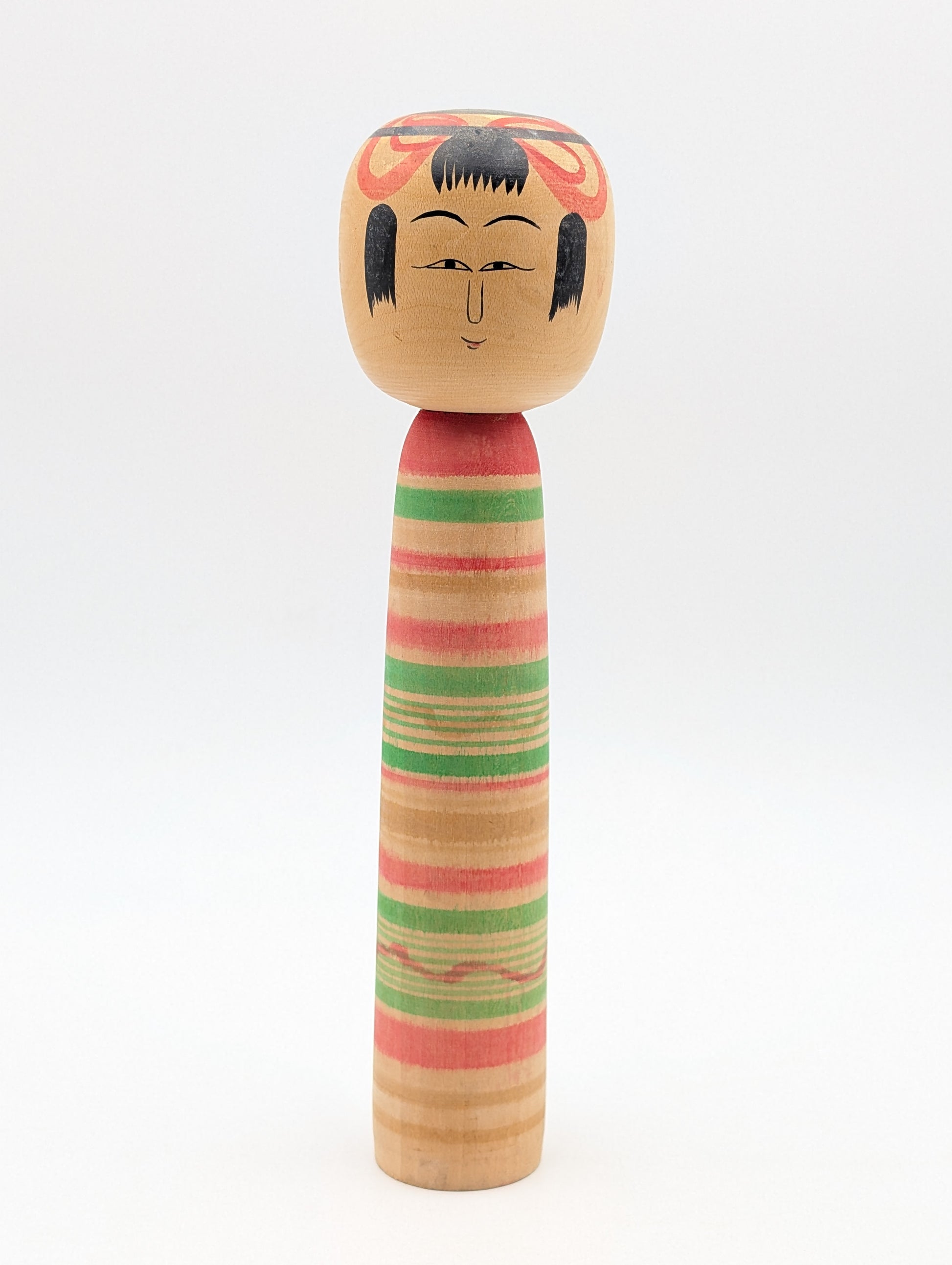 Kokeshi tradizionale vintage in legno interamente realizzata a mano in stile Tsuchiyu. Le kokeshi Tsuchiyu nascono nella prefettura di Fukushima e la loro caratteristica tipica sono le linee orizzontali di diversi colori che adornano il busto. Solitamente presentano sulla testa un design di cerchi concentrici di colore nero chiamato janome (occhio di serpente). ll viso é incorniciato da una frangetta a forma di pettine, due ciuffi di capelli laterali, un naso rotondo (in questo caso un naso lungo chiamato tare-bana), e occhi incurvati. Sotto la kokeshi è presente la firma dell'artista. Misure: 25cm x 4cm. Nonostante sia un pezzo vintage le sue condizioni generali sono buone.