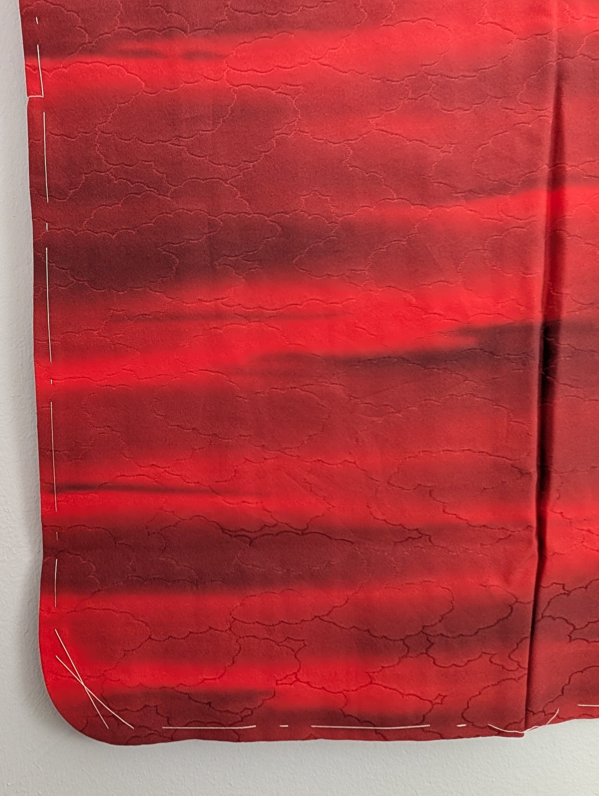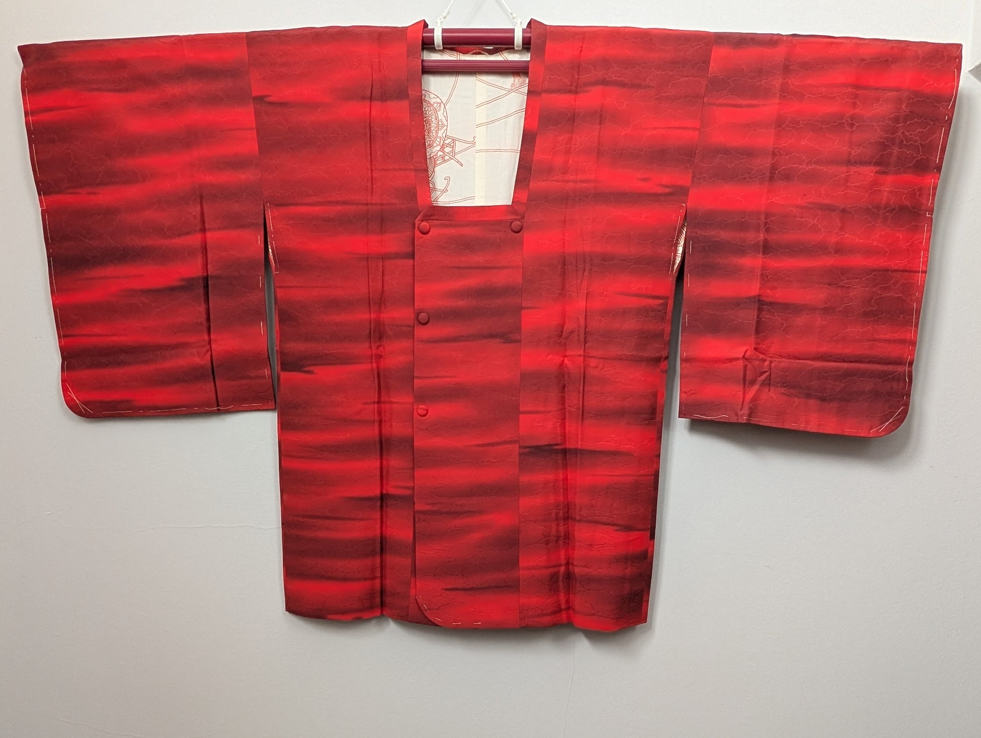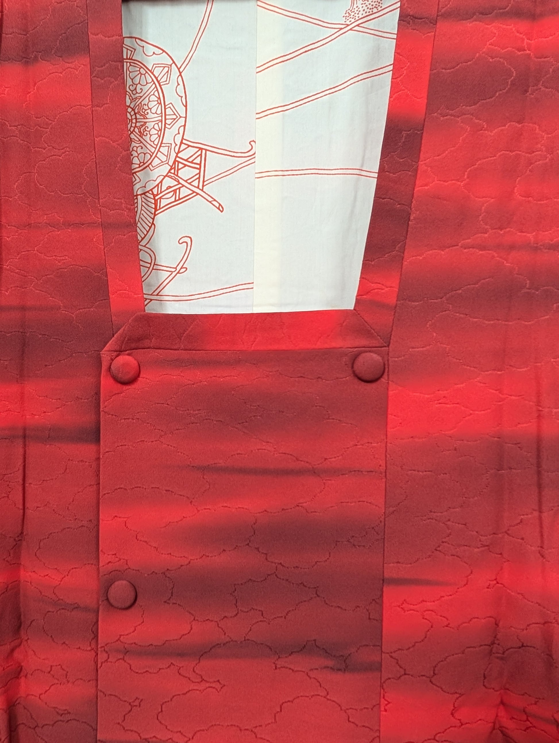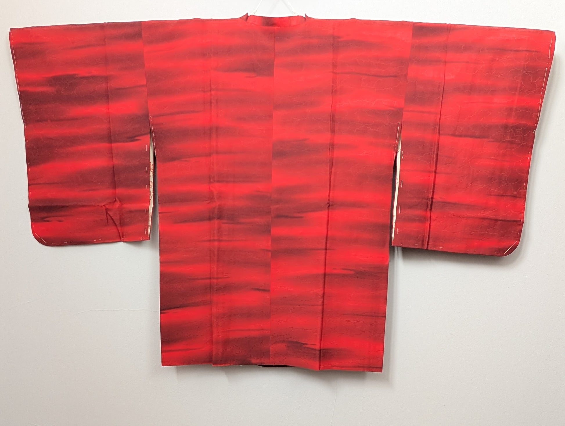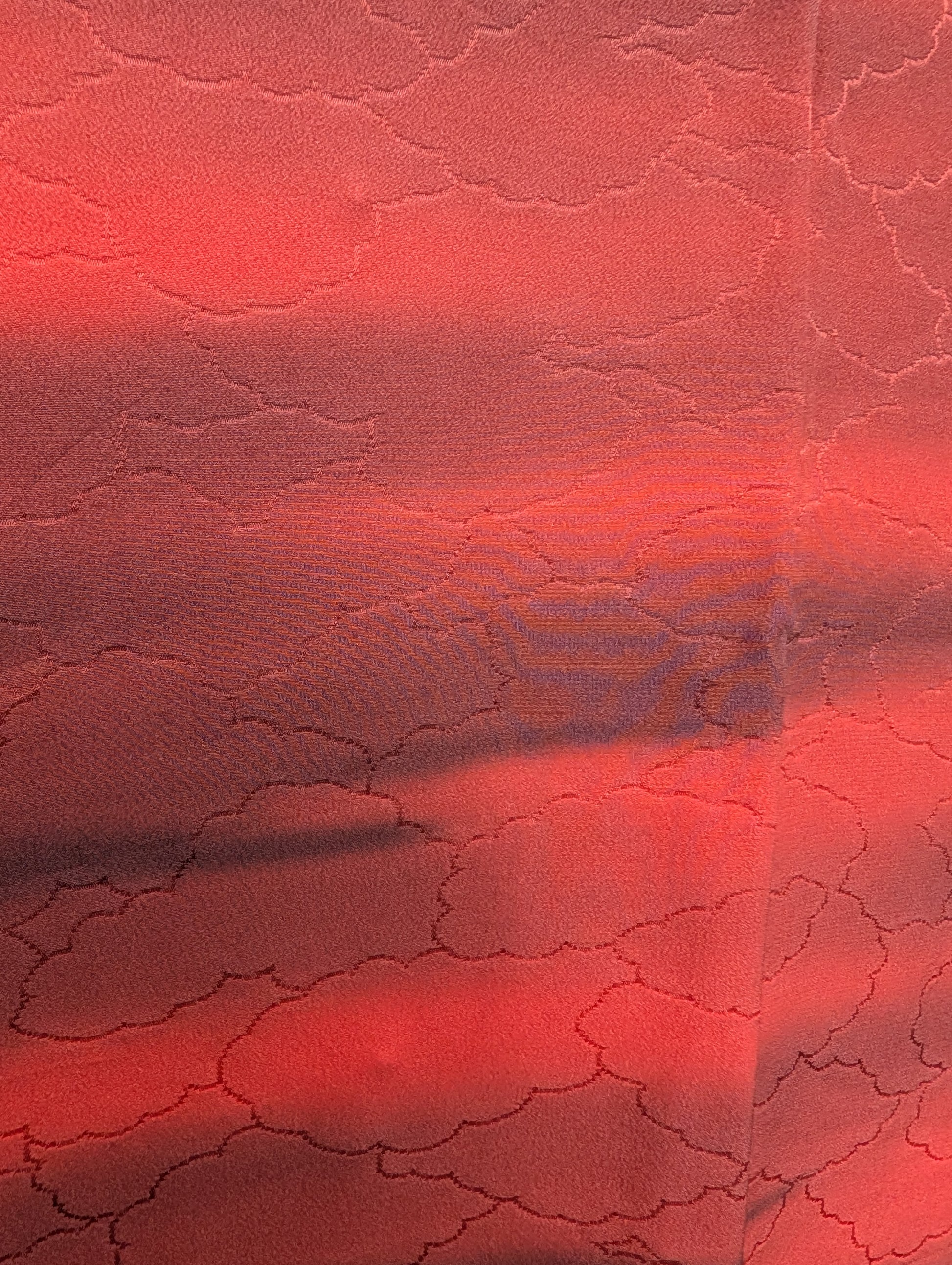 Michiyuki vintage in seta nei toni del rosso sfumato e tonalità violacee con motivo di nuvole.