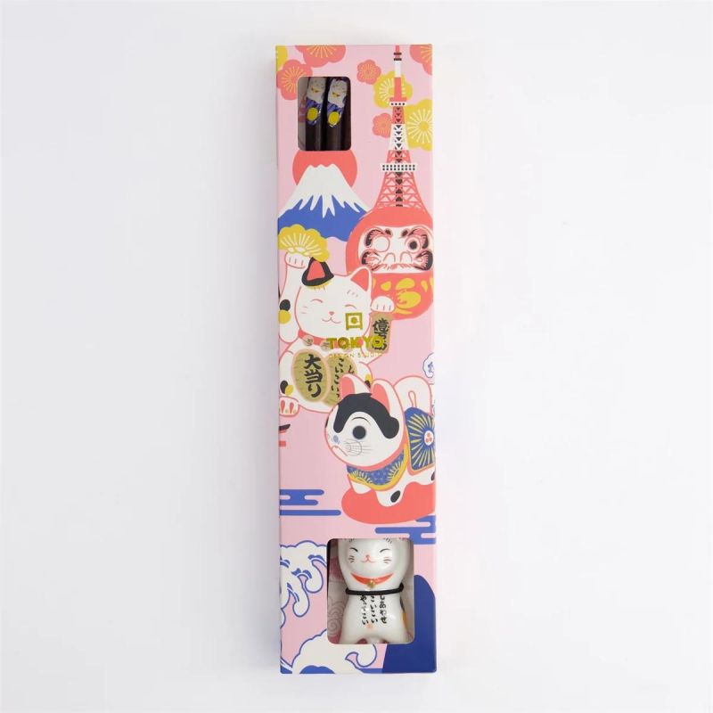 Set composto da un paio di bacchette in legno, con motivo di gatto portafortuna, e da un poggia bacchette in porcellana a forma di gattino.