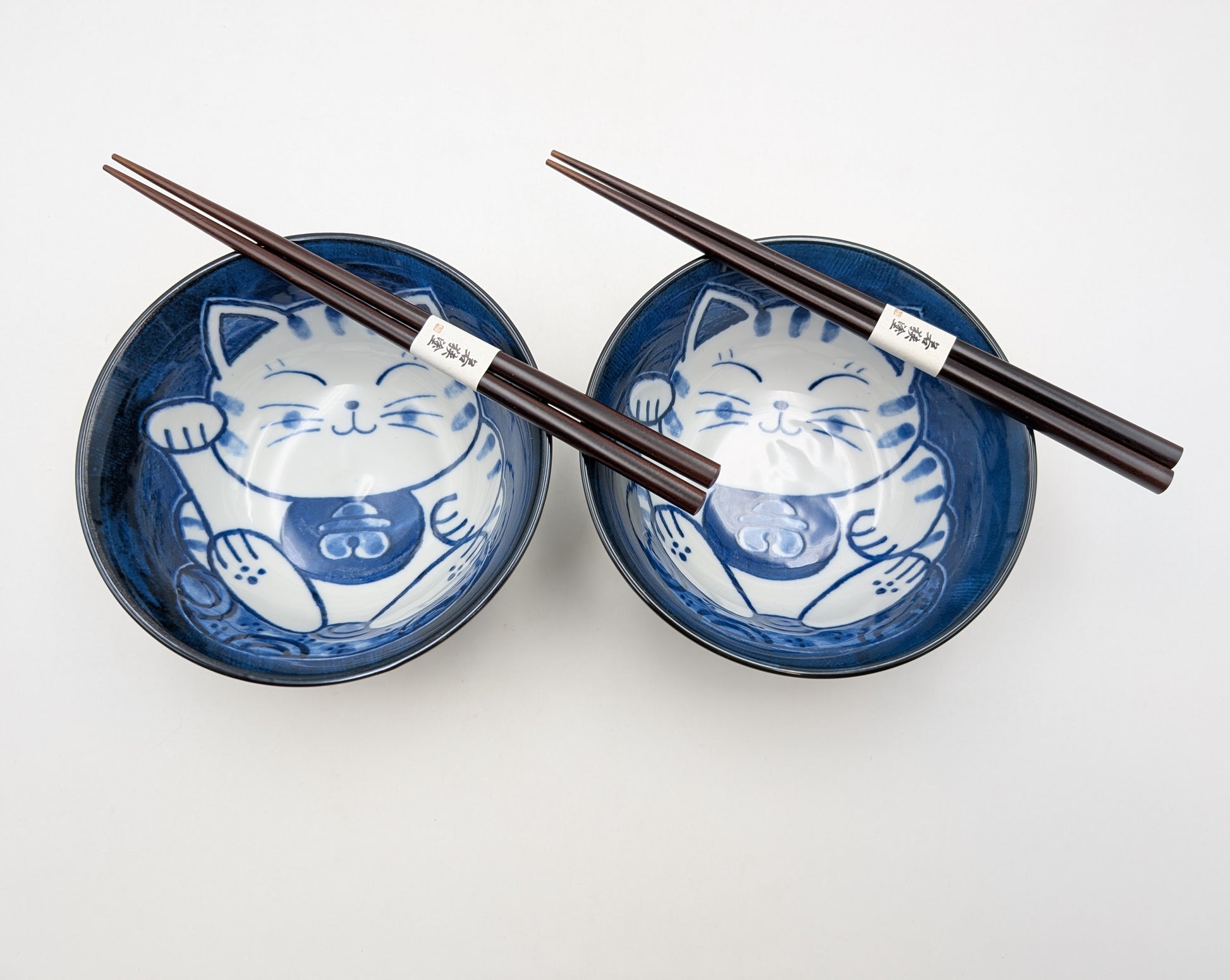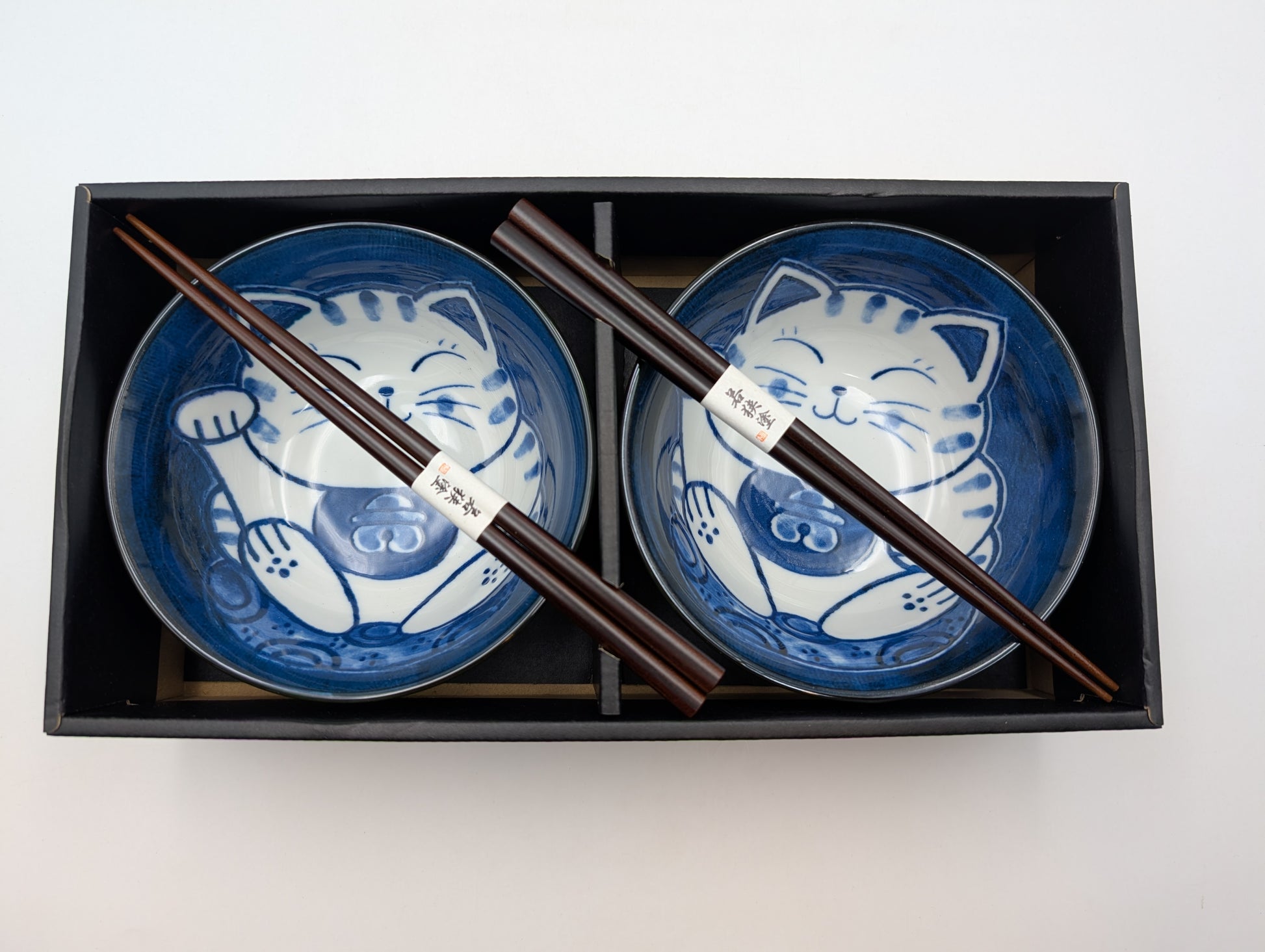 Servizio composto da due ciotole in porcellana, sulle quali è raffigurato un maneki neko (gatto portafortuna), e da due paia di bacchette in legno.