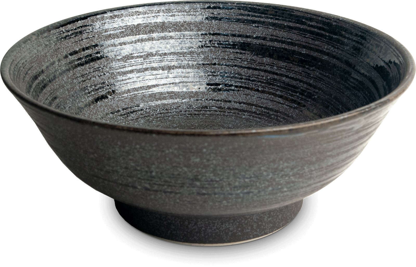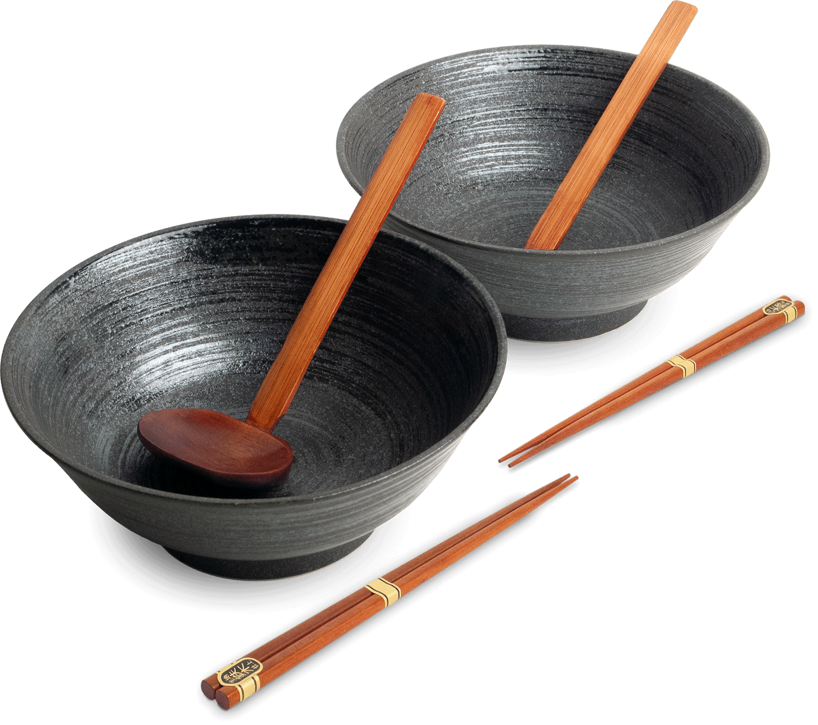Servizio composto da due ciotole da ramen in ceramica Mino Yaki, da due paia di bacchette in legno e da due mestoli/cucchiai in legno.